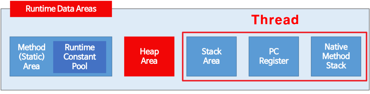 런타임 데이터 영역은 JVM의 메모리 영역으로 자바 애플리케이션을 실행할 때 사용되는 데이터들을 적재하는 영역이다. 이 영역은 Method Area, Heap Area, Stack Area, PC Register, Native Method Stack으로 나눌 수 있다.